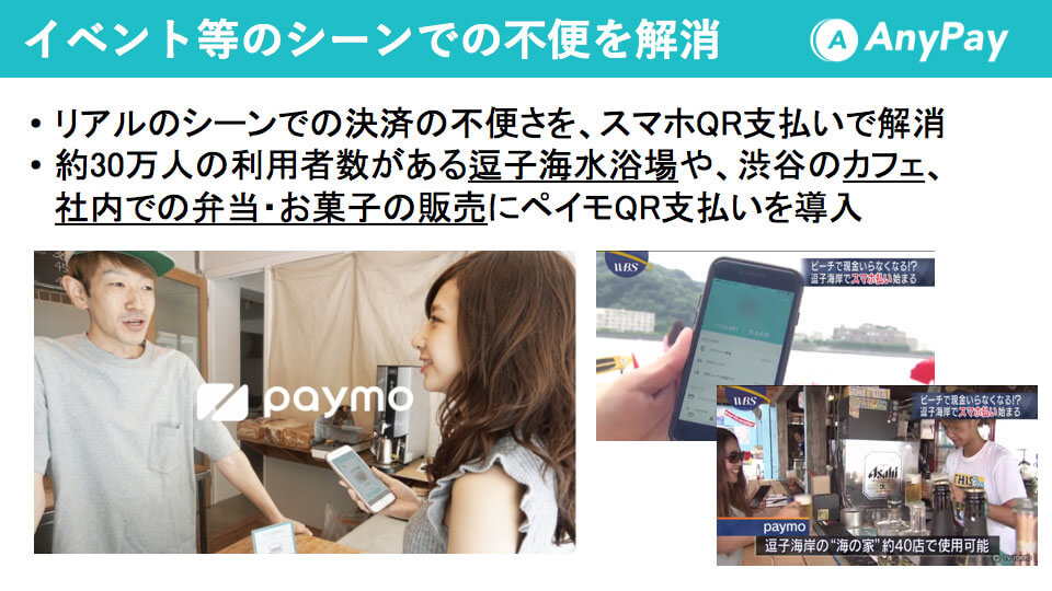 こちらはQR決済の例なのですが、今年paymoを逗子の海水浴場の海の家に導入いただきました。30万人ぐらいお客様がいらっしゃるところです。