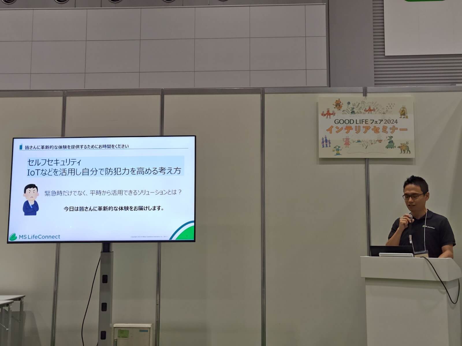 昨年も出展されていたインテリア産業協会さんのセミナーブースをお借りして、スマートホームのセミナーや、LTAにご参画されていて、隣のブースに出展されていた三井住友海上火災保険様も「MS Life Connect」というAIカメラを活用した見守りサービスに関するショートセミナーを実施しました。