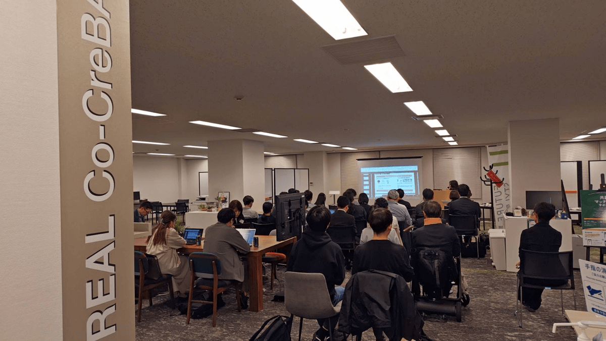 今回は、会場として、会員企業の日鉄興和不動産様が運営されている「Co-Creation BASE」(略称「コクリバ」)をお借りしました。先進のテクノロジーやノウハウを有する企業と共に、次世代の暮らしを開発、実装するための共創型の取り組みとして、個人(会社勤めの方もOK)の会員制(無料登録)のコワーキングスペースです。是非ご活用ください。