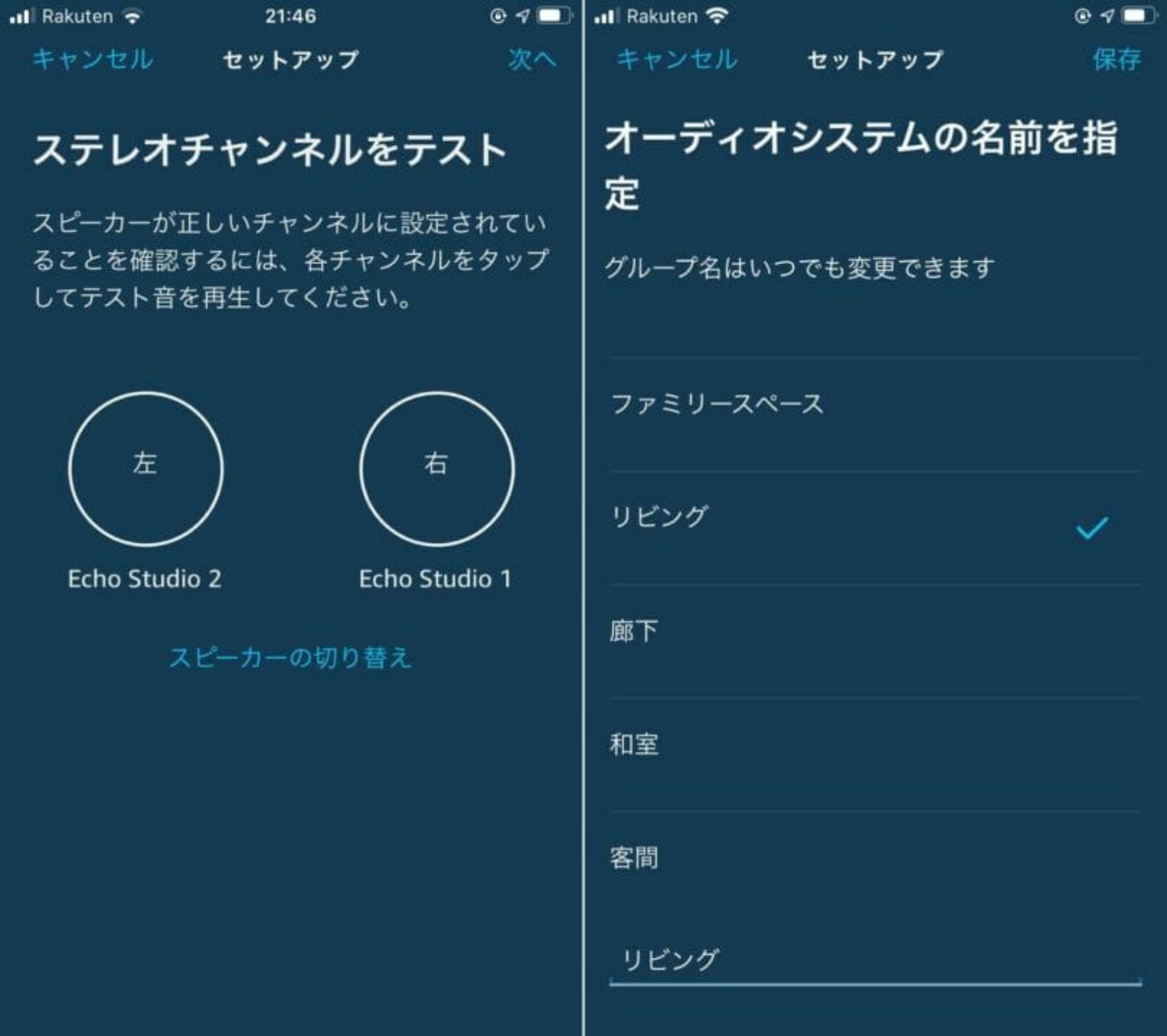 画面の指示に従い、左右のスピーカーを判定するチャンネルテストを行います。最後に、このオーディオシステムをどのグループ(部屋の名前など)に割り当てるかを設定して完了です。