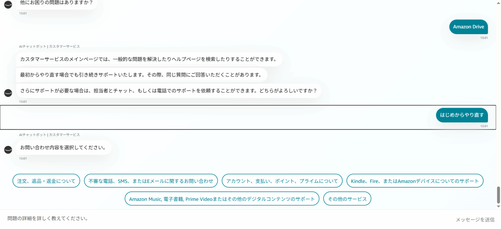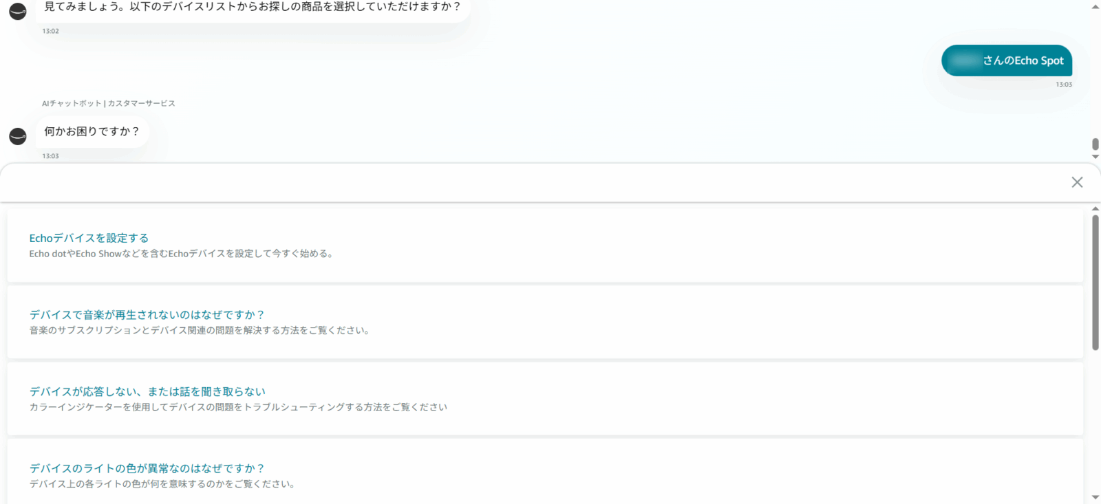 カスタマーサービスに連絡を選ぶとAIチャットBotが起動して回答を選択していくとFAQが表示されたり、担当者とやり取りできたりします。