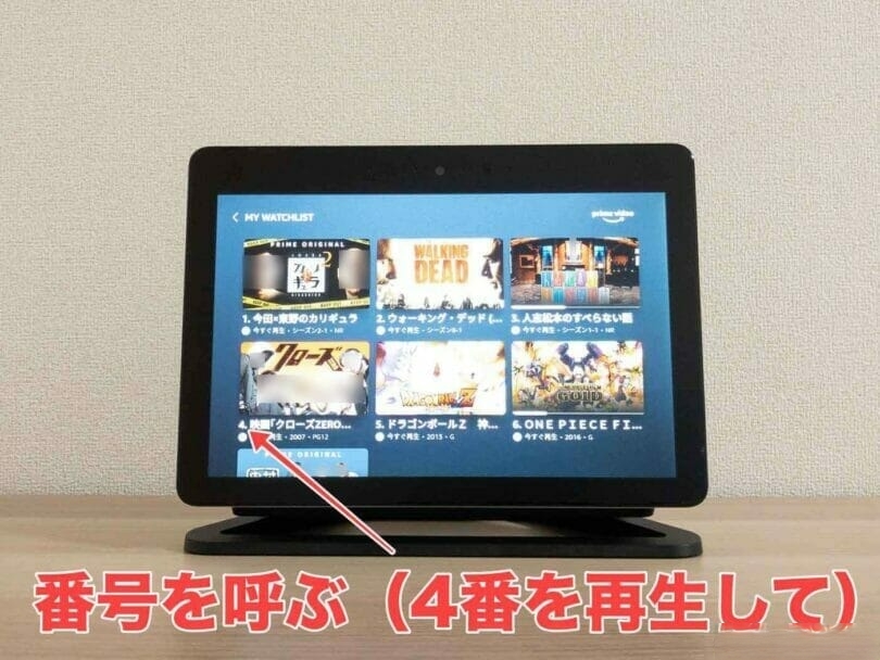 ウォッチリストが表示された後は、コンテンツごとに割り振られた番号を「アレクサ、1番を再生して」のように伝えることで、画面に触れることなく再生が可能です。