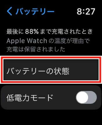 - Apple Watchで「設定」→「バッテリー」→「バッテリーの状態」を開く