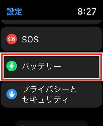 - Apple Watchで「設定」→「バッテリー」を開く