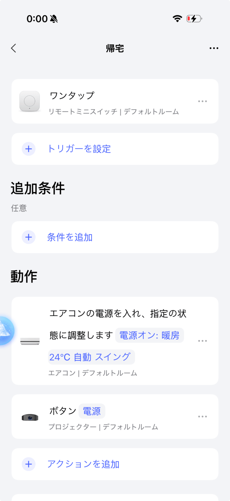 「オートメーション」機能はさらに高度で、トリガー(きっかけ)に対してアクションを設定するだけでなく、追加の条件を細かく設定できます。たとえば「ドアが開いたら照明をつける、ただし日没後に限る」「人がいて、かつ室温28度以上のときだけエアコンをON」といった、かなり複雑な条件付き自動化が可能です。