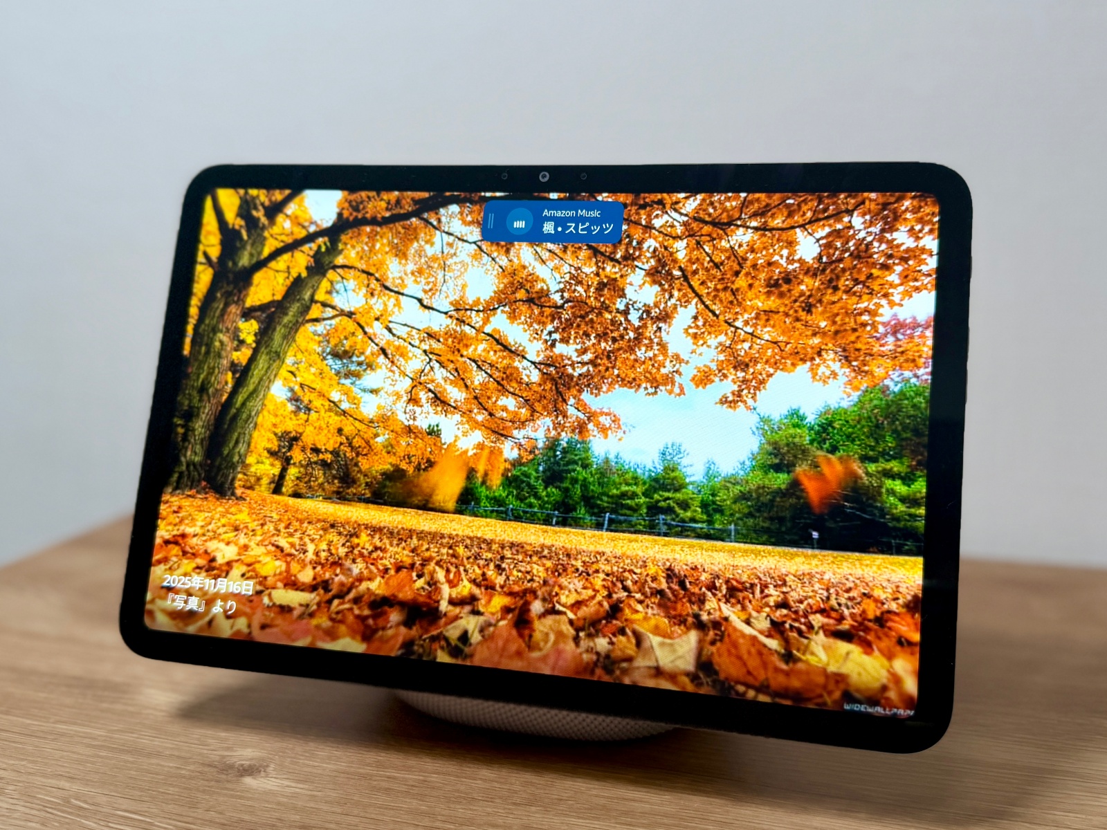 「Echo Show 11」は、11インチの大型フルHDディスプレイと強化された音響システムを搭載した、Amazonのフラッグシップスマートディスプレイです。大画面を活かした動画視聴やビデオ通話、デジタルフォトフレームとしての利用はもちろんのこと、次世代の共通スマートホーム規格であるMatterおよびThreadボーダールーターに対応し、未来のスマートホーム体験をリードするデバイスとして設計されていました。カスタム設計された新世代プロセッサー「AZ3 Pro」を搭載し、操作レスポンスも大幅に向上していて使い勝手が良かったです。