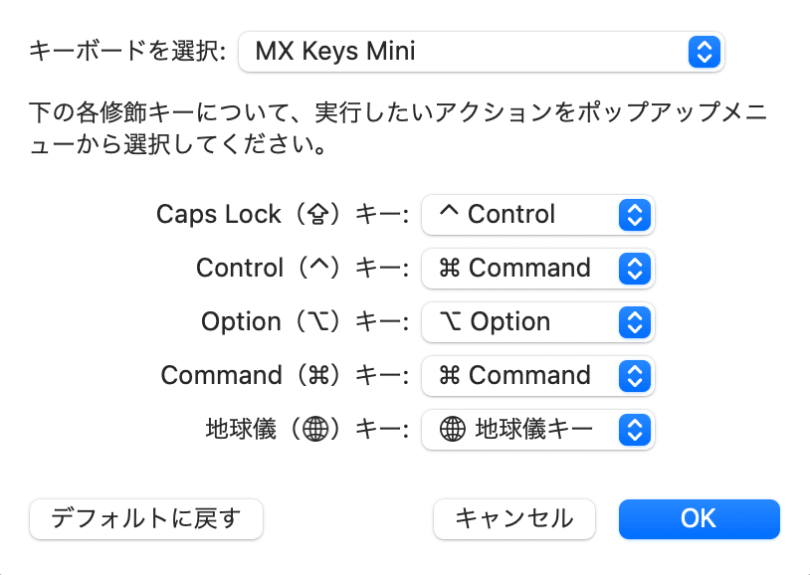 また、Caps LockとCtrlの位置もMacBookとは異なります。macOSの「システム設定 → キーボード → キーボードショートカット → 修飾キー」から変更することで解消できます。