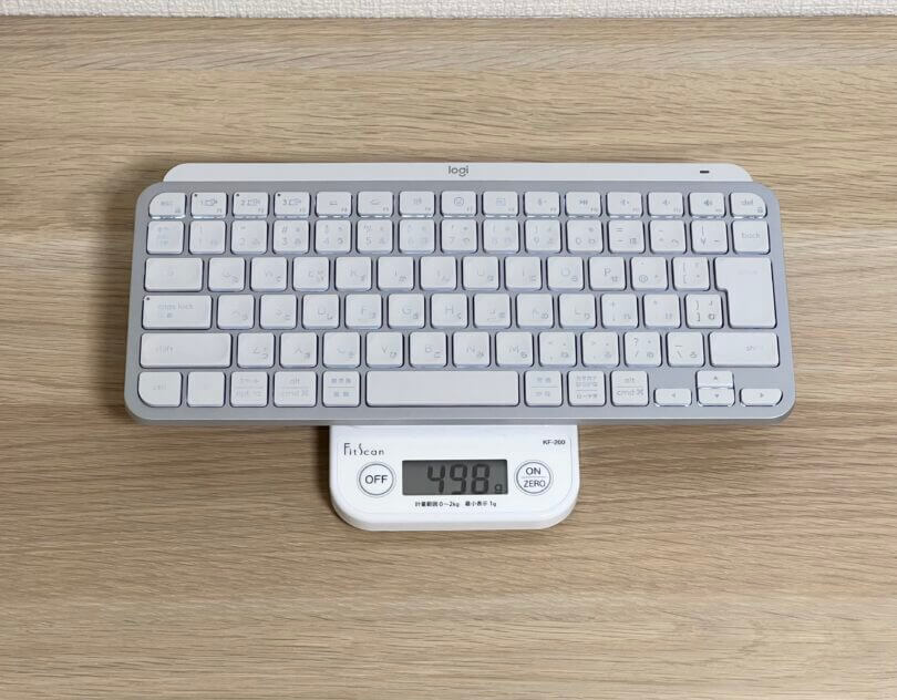 MX Keys Miniの本体重量は約506g。Bluetoothキーボードとしてはずっしりとした重量感があり、カフェや外出先への持ち運びには向いていません。