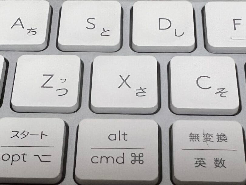 特に気になりやすいのがCommandキーのサイズと位置です。Commandキーと隣の英数キーがやや小さく配置されており、左手だけで「Command+C(コピー)」などの操作をする際に窮屈に感じることがあります。