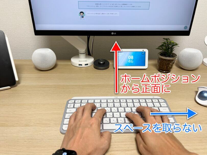 テンキーレスのMX Keys Miniなら、キーボードとマウスを自然な位置に置けるため、正面にモニターを据えたすっきりしたデスク環境が作れます。