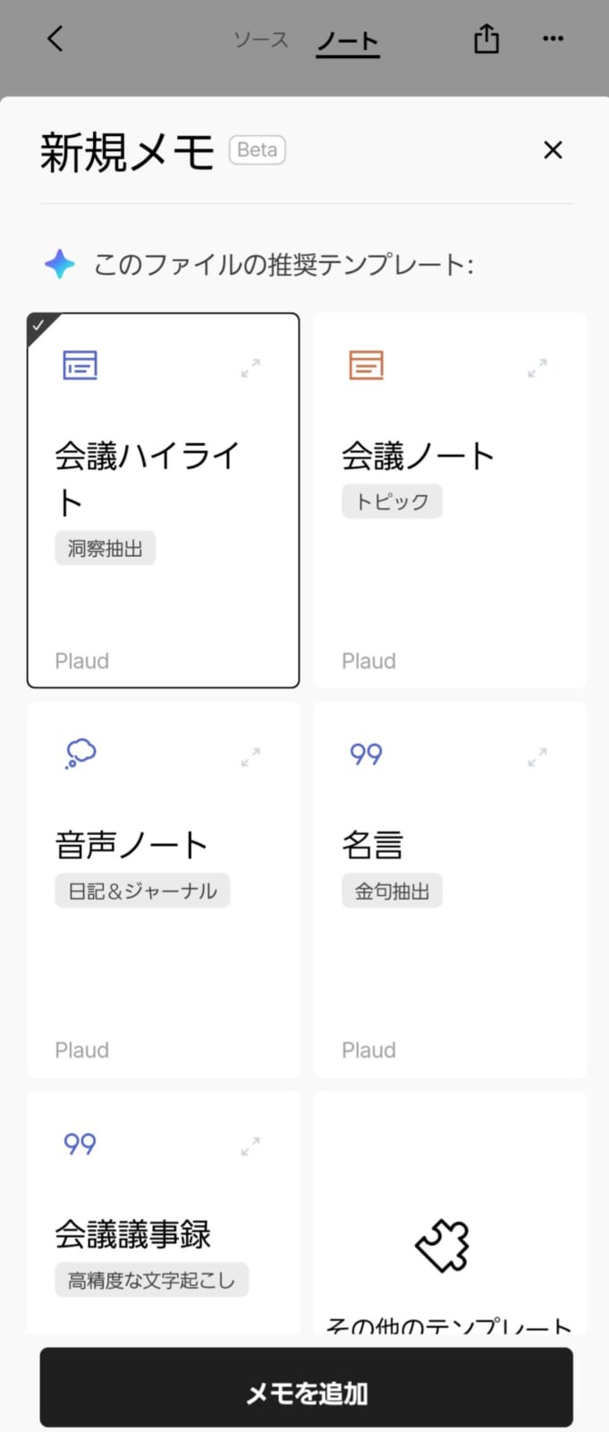 Plaud Note Proには「会議」「講義」「インタビュー」など多様なテンプレートが用意されています。