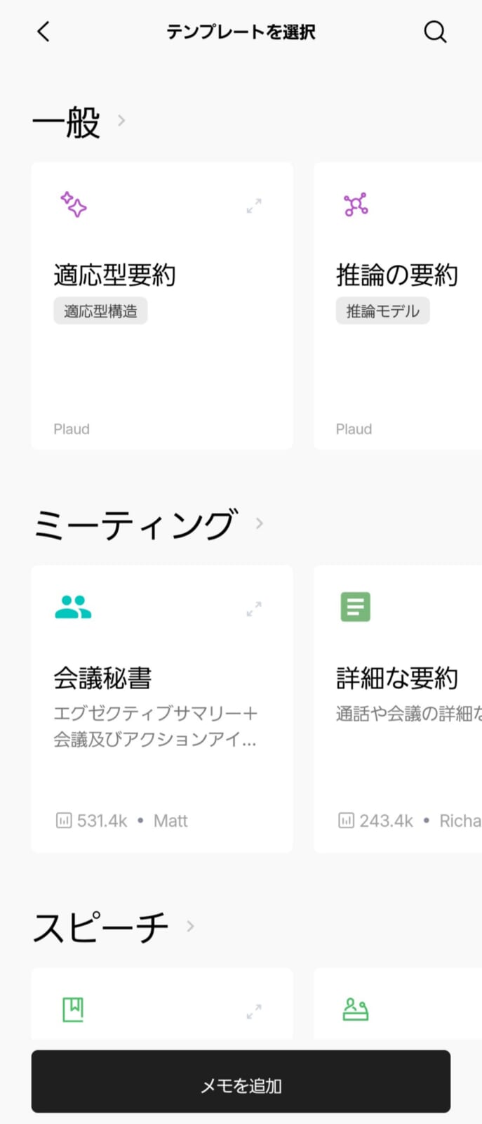 Todoや要約のみならず、「会議秘書」や「名言」「スピーチ」、要約にも適応型から詳細、推論要約といったテンプレートまで様々あることは大きな特徴です。そのプロンプトをわざわざ考える必要がありません。