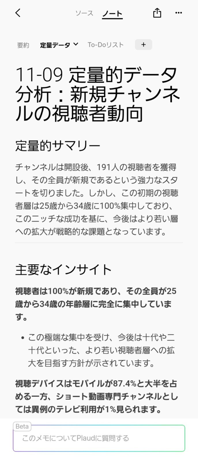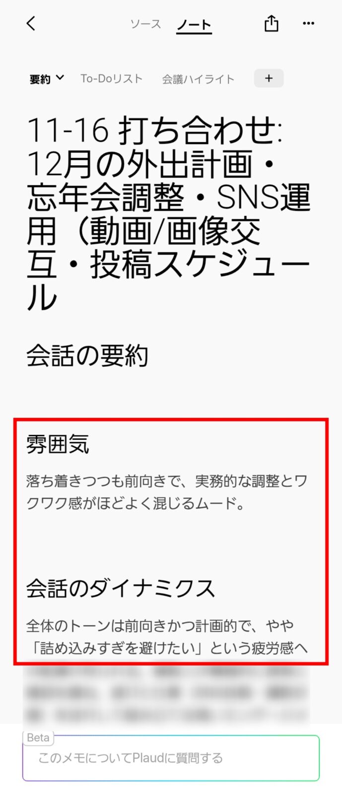 一方で、長時間にわたる詳細な会議では情報量が膨大になるため、実務的には「ノート機能(上記の要約やテンプレート、Todoリスト)」を利用する頻度が高くなるでしょう。シーンに応じた使い分けが可能です。