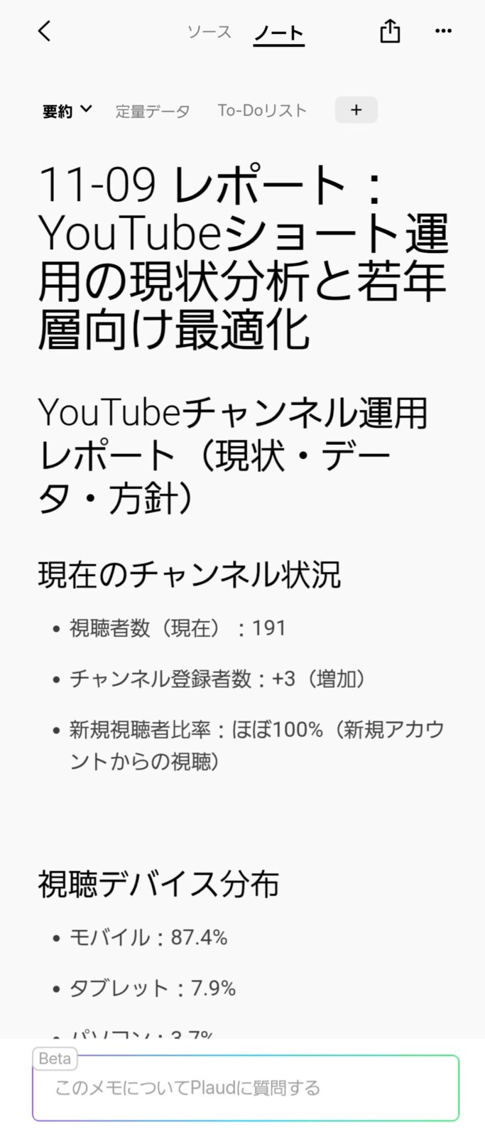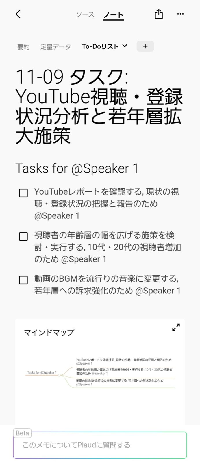 しかし、Plaudの強みは「ノート機能」にあると感じています。たとえ生ログに多少の間違いがあっても、高性能なLLMが文脈を理解し、「要約ノート」の方は極めて正確な内容で生成されます。
