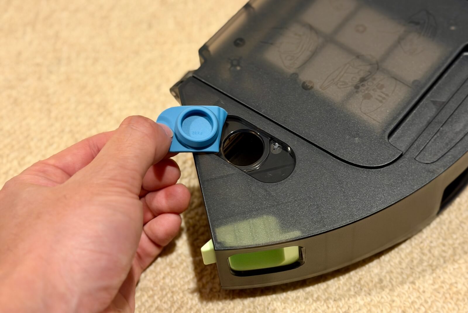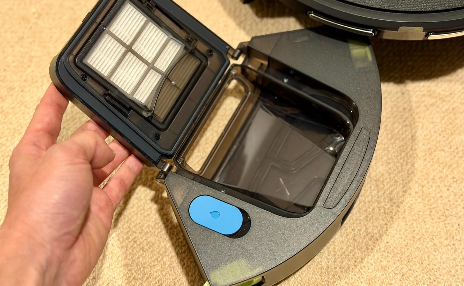 本機は掃除機掛けと水拭きを同時にこなす「コンボ」仕様です。ダストボックス部分には注水口が設けられており、ここから直接水を注入することで、水拭きの準備が完了します。