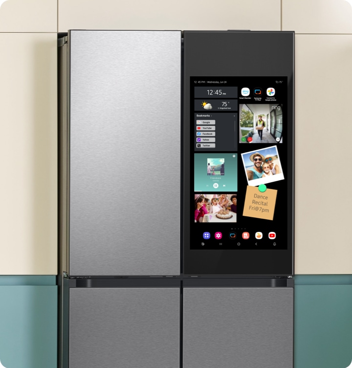 例えば、Samsungの「Family Hub」シリーズのようなスマート冷蔵庫に搭載された大型ディスプレイです。内蔵カメラで庫内の食材を確認したり、AIが食材を認識してレシピを提案したり、家族間のメッセージボードやカレンダーとしても機能します。