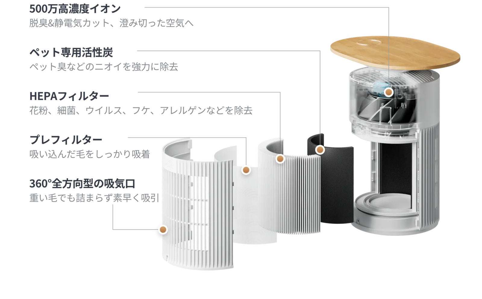 特に脱臭フィルターにはペット専用の活性炭が使われているとのことで、ニオイへの対策も強化されています。