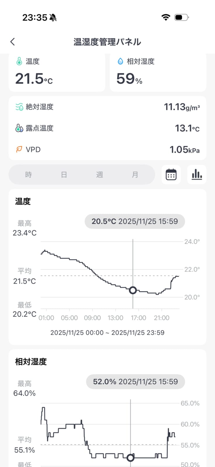 今日の温湿度のグラフを見たり、翌朝のタイマー設定をしたりします。