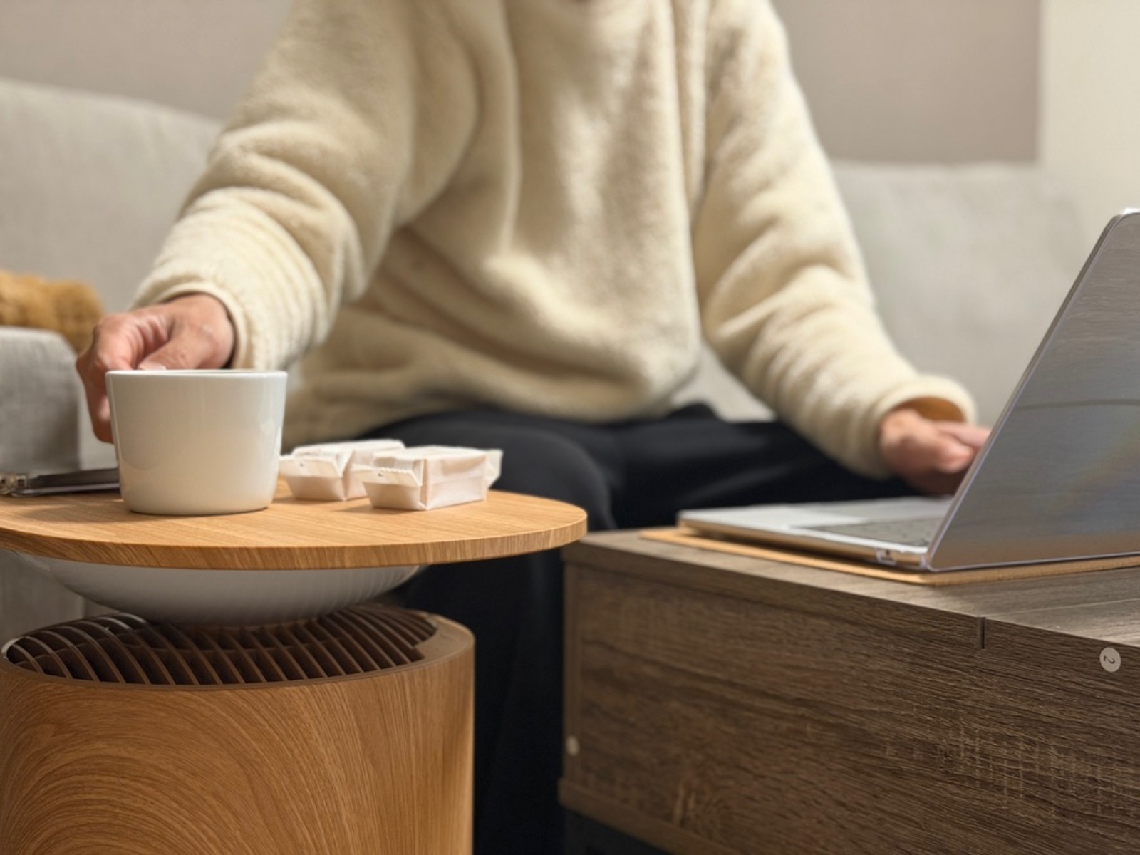 空気清浄機であるにも関わらずサイドテーブルとして使えるので、コーヒーやお菓子をここに置いたりしてくつろいでいます。
