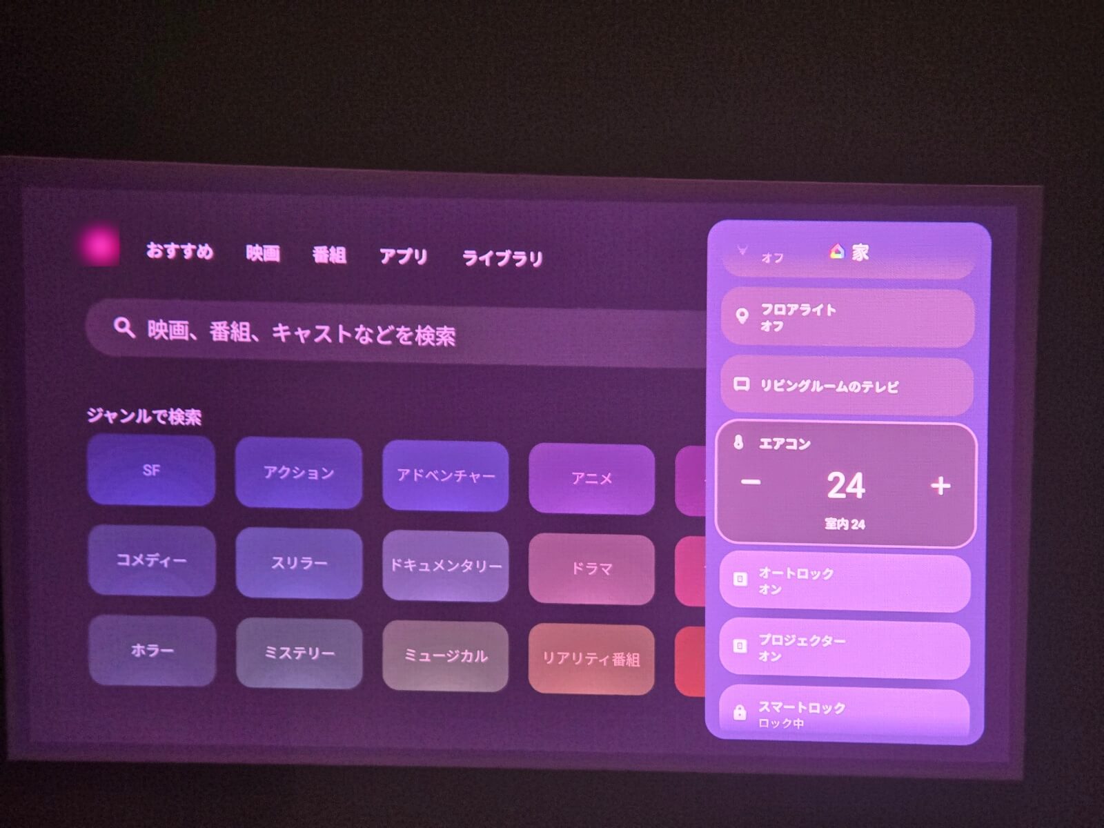 自動台形補正やオートフォーカスも非常に優秀です。部屋を移動させた際も一発で綺麗な長方形スクリーンに調整してくれるため、手動で追い込む手間がほとんどかかりません。